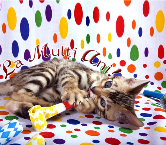Pisicuta tigrata, care se joaca pe un fundal multicolo cu un fluier de petrecere.