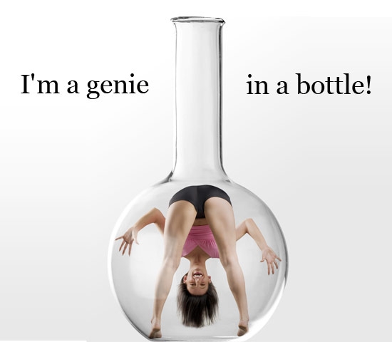 Felicitare indrazneata cu o fata provocatoare, captiva intr-o sticla cu gat ingust.