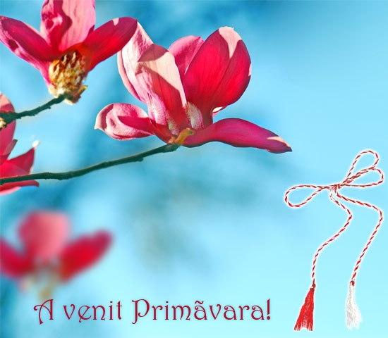 Sarbatoreste venirea primaverii si trimite o felicitare cu magnolii inflorite cu aceasta ocazie .