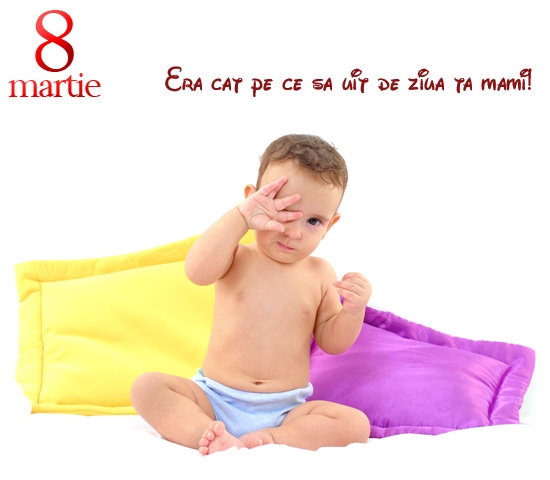 Felicitare de 8 Martie cu un copilas adormit, ridicandu-se dintre perne.