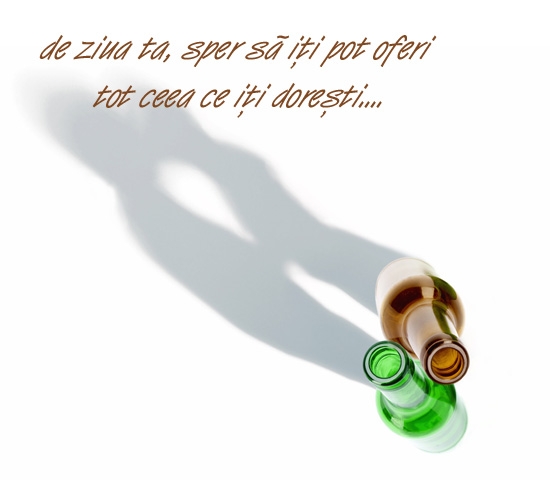 Felicitare cu subinteles: doua sticle de bere care se ciocnesc se reflecta ca doua trupuri imbratisate.