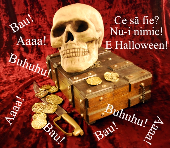 Felicitare cu interjectii de Halloween, un craniu si comoara piratilor. Buna de speriat prietenii.