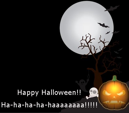 Felicitare sinistra de Halooween, cu o luna plina si un dovleac care priveste malefic. Urarea de Happy Haloween este insotita de un ras rautacios. Potrivita prietenilor si colegilor care sarbatoresc Halloween-ul.