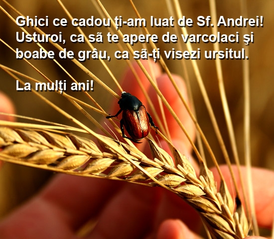De Sf. Andrei, se spune ca e bine sa te feresti de varcolaci cu usturoi si sa ai boabe de grau sub perna ca sa-ti visezi ursitul. Felicitarea este una traditionala pentru Sf. Andrei, trimite-o unui prieten drag.