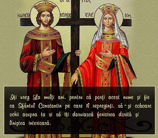Felicitare religioasa cu figurile Sfintilor Constantin si Elena, insotita de o urare traditionala.