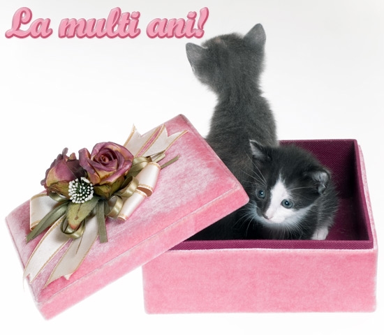 Animalele de companie sunt cel mai frumos cadou la o zi de nastere. Din cutia roz, ies doua pisicute curioase.